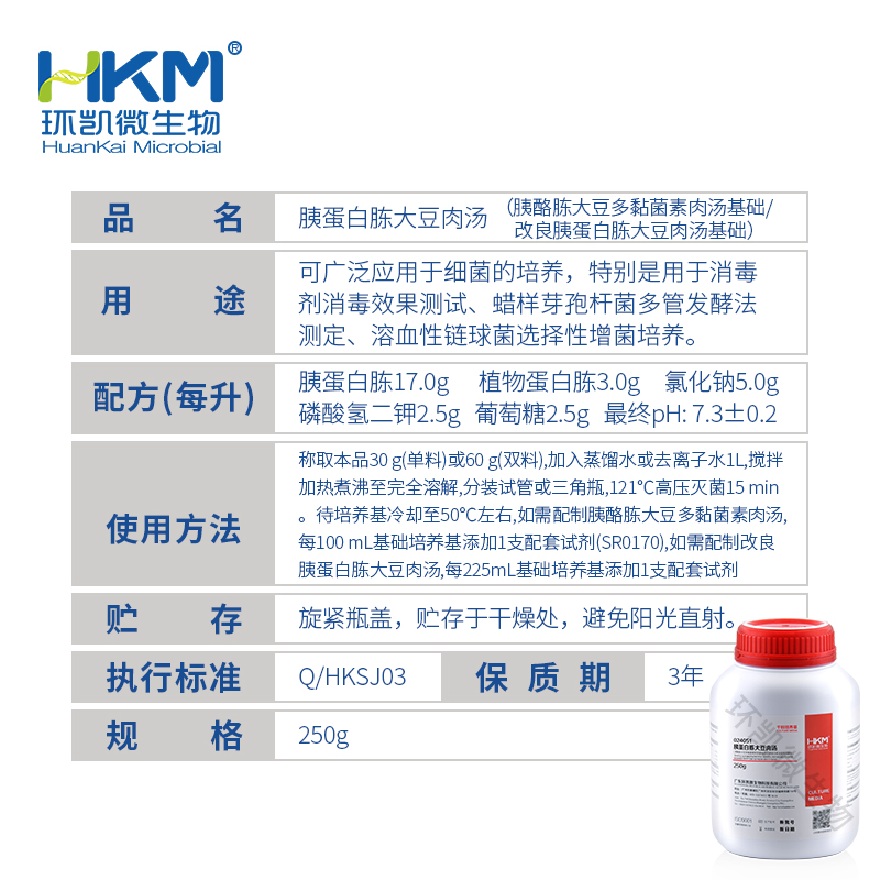 024051 胰蛋白胨大豆肉汤培养基(胰酪胨大豆多粘菌素B肉汤基础)TSB 250g 环凯